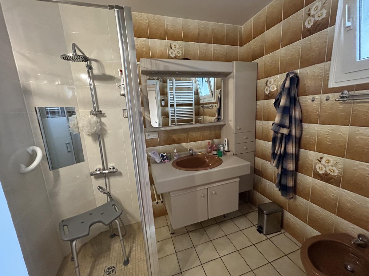 - Au rez-de-chaussée surélevé : entrée sur dégagement, salon/séjour, véranda avec ascenseur, cuisine meublée, trois chambres, salle d’eau, wc.
